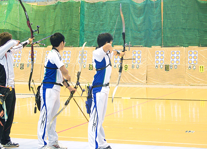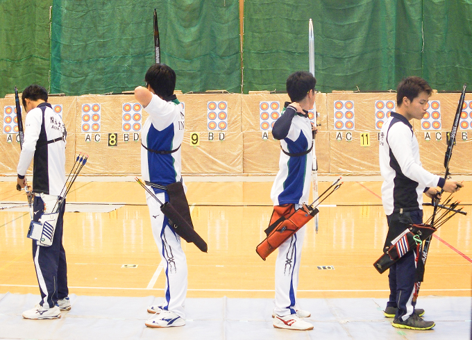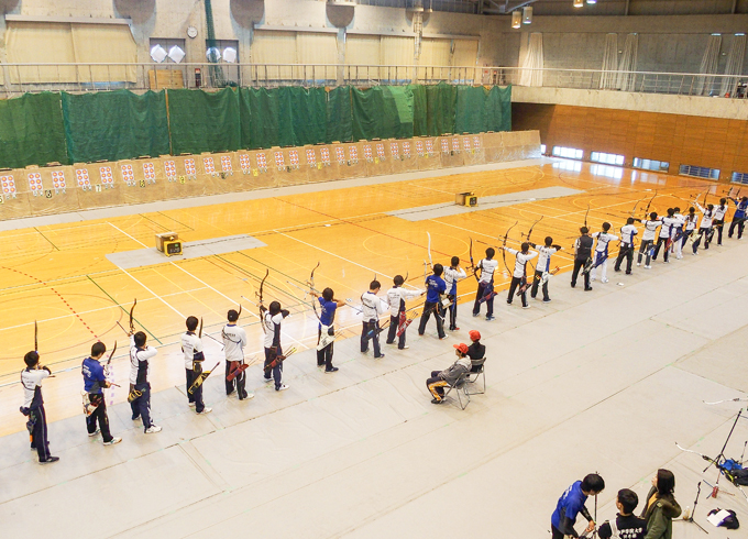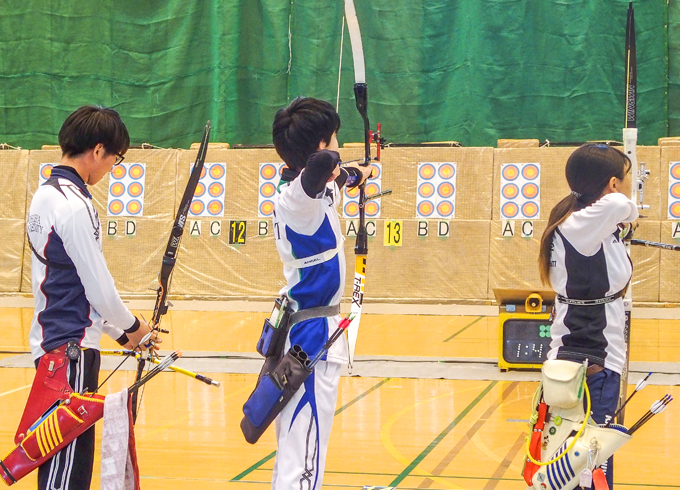 冬期に屋内で行われる種目です。的までの距離18mで、2分3射×10回、計30射(300点満点)で得点を競います。縦に3つ並んだ的に、それぞれ1本ずつ矢を射ちます。