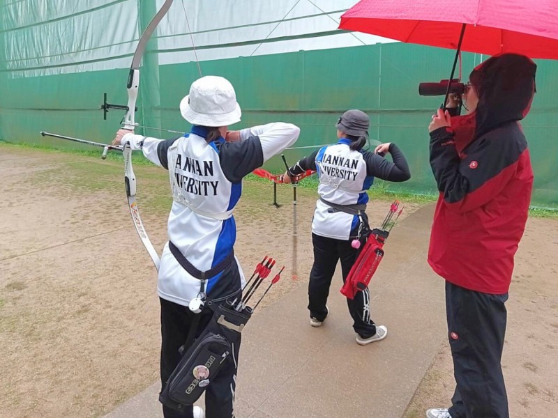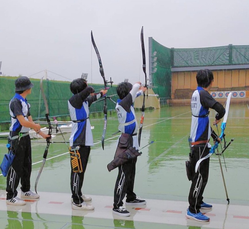 4月の毎週日曜日に、男子65回・女子60回関西学生アーチェリーリーグ戦および第24回Extra Matchが開催されました。この試合は関西学生アーチェリー連盟に所属している大学が参加し、男子は5名、女子は3名の合計点で競う試合です。阪南大学は男子が2部リーグに、女子は人数不足のためExtra Matchに出場しました。結果は、男子は1勝3敗、女子は記録会のため勝敗は付きませんでした。