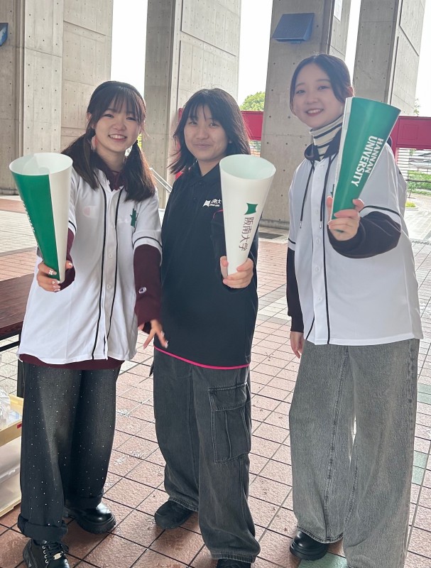 試合当日はあいにくの雨天となりましたが、約100名弱の阪南大学関係者——学生の皆さん、教職員、そして保護者の皆様——が会場に駆け付けました。