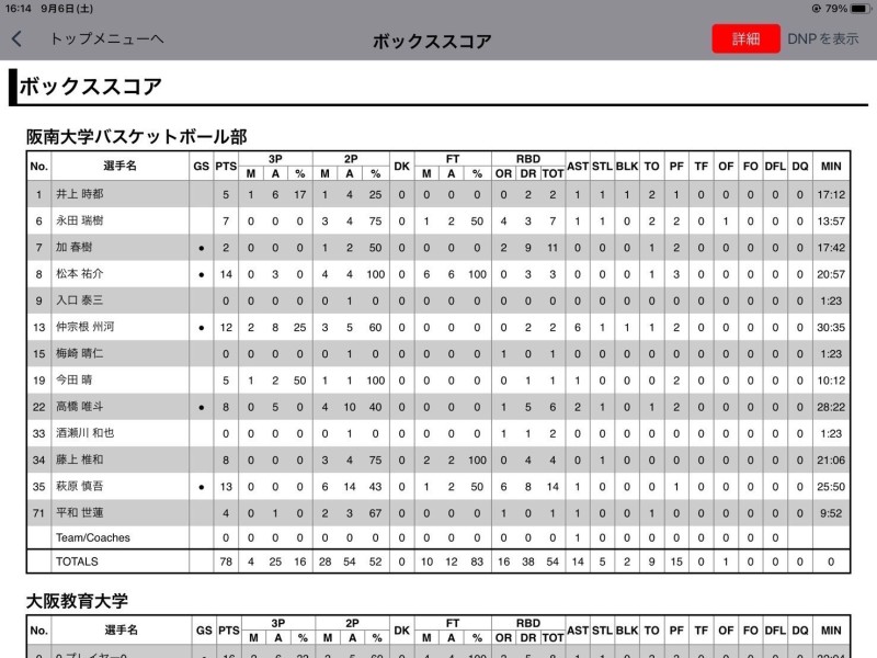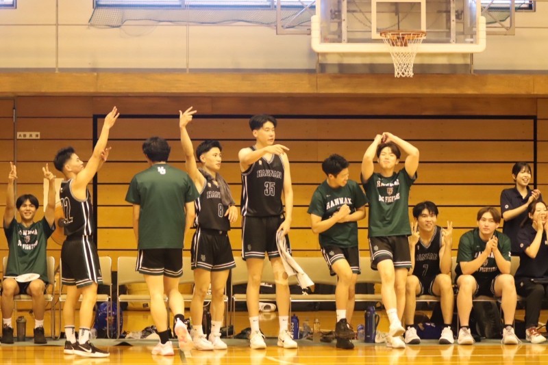 4クォーター、チームとしての試合への入り方が良く、#6永田のオフェンスリバウンドからの得点で勢いがつき、#1井上のスリーポイントなどで点差を大きく開き、78対53で試合終了。阪南大学が勝利しました。今シーズンのリーグ戦は1部昇格、2部リーグ優勝を目指しているので、