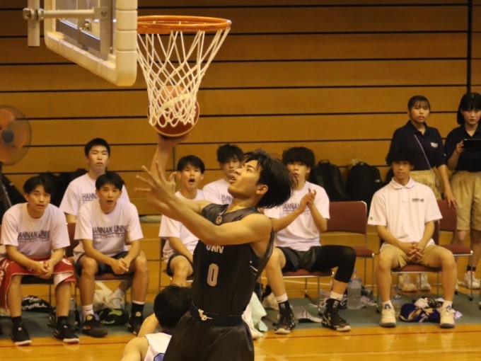 第3クォーターでは、阪南が波に乗り、オフェンスもディフェンスもよく、42対56と大量にリードしました。第4クォーターでは相手も食らいついて来ましたが、64対82と大差をつけて勝つことができました。