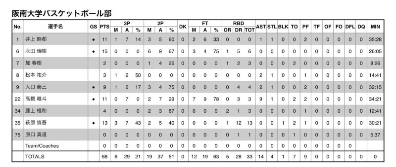 第3クォーター、相手のリバウンドからのゴール下のシュートに苦しめられるが、#35萩原のサイズを活かしたリバウンドとスリーポイントで点差を離されず54-57でこのクォーターを終えました。第4クォーター、#6永田のゴール下での1対1や体を張ったプレーで点差は付かず離れず。ラスト4秒、相手の3点リードで阪南のオフェンス、#9入口のスリーポイントに賭けたが惜しくも外れてしまい、68-71で負けてしまいました。