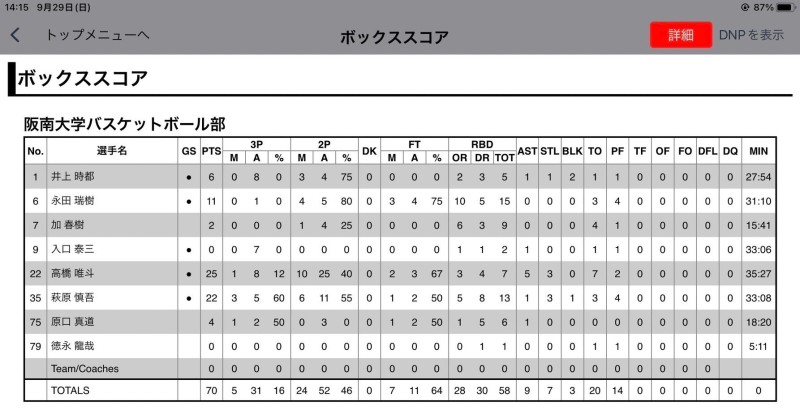 第3クォーター、#6永田、#35萩原のインサイドプレーを中心に点数を重ねていきましたが、相手の3ポイントシュートを止めることが出来ずに、60対78で終了しました。何としても追いつきたい第4クォーター、試合の流れが完全に相手に行ってしまい、70対96で敗北しました。