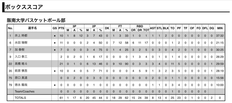 第3クォーターは#1井上 、#22高橋 中心に点数を重ねて攻撃をするが、シュートが余り入らない時間帯が続いてしまい、相手の波を止めることが出来ずに47対54で終了しました。追いつきたい第4クォーター、#6永田 のゴール下プレーで点数を重ねていくが、相手に流れをもっていかれてしまい追いつくことができずに61対69で敗北しました。