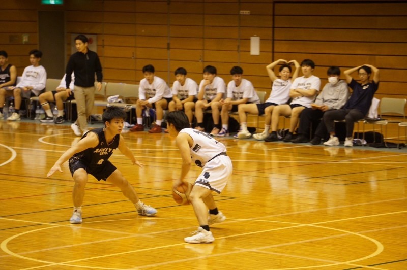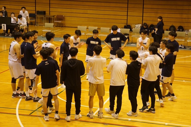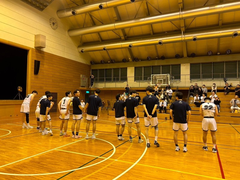 びわこ戦から負けが続いて2勝6敗で迎えた9戦目、会場は本学のホームコートで相手は芦屋大学でした。第1クォーターは、相手に先制点を決められるも#7加、#35萩原、#6永田がゴール下を決め、#9入口、#22高橋、#1井上の外からのシュートが決まり31対20で自分たちのペースで点差を空けることが出来ました。第2クォーターも同じように厳しいディフェンスで相手を止め、積極的な攻めとリバウンドでフリースローを貰い、点を決めて51対41で点差を詰めさせずに終えました。後半の第3クォーター、ディフェンスから始まり相手の1本目を止め、#22高橋が先制点、その後、#35萩原がゴール下を決めて、さらに#75原口の3ポイントが決まりました。前半と変わらないオフェンスとディフェンスで、77対63でリードしたまま最終クォーターを迎えました。ラスト10分は、点差がひらいている中でも全員が気を抜かずオフェンスもディフェンスもやり切り、99対86という結果で終えました。チームで練習してきた事を全員がやりっきた事で勝つことが出来ましたが、今回の試合で新しいチームや個人の課題が明確になりました。まだリーグ戦は終わってないので、引き続きチーム全員で頑張っていきます。