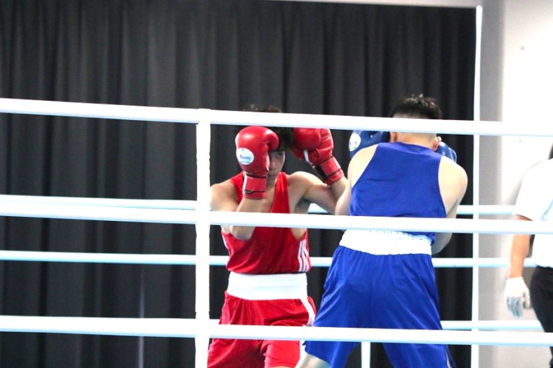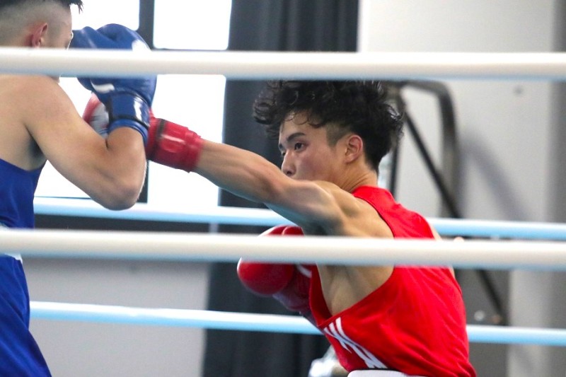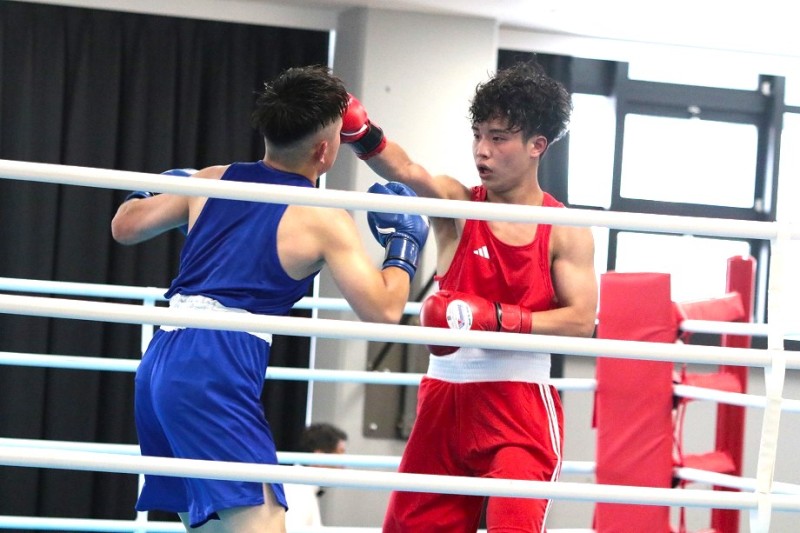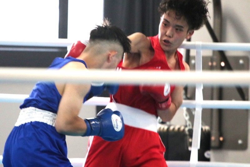 ライト級 濱田 遼己選手(赤コーナー 国際学部国際コミュニケーション学科1回生)VS大阪国際大学の選手(青コーナー)