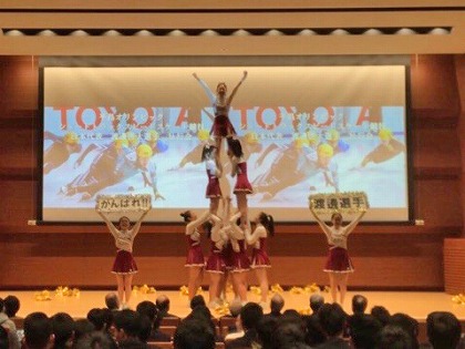 1月9日(火)に平昌オリンピックに出場される本学教員の渡邊啓太選手の壮行会が開催されました。私たちは、壮行会に先駆けオープニングで演技を披露させていただきました。たくさんの方々の前で演技させていただき、とても貴重な経験となりました。