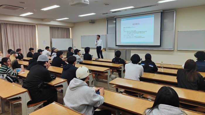 2025年10月27日(月)、経済学部「グローバル・ビジネス論b」において、株式会社三ツワフロンテック取締役の中川諭様による特別講義「B to B 営業」を実施しました。「営業職」と聞くだけで避ける学生が少なくない中で、B to C営業とは異なるB to B営業の魅力を知ってもらうことを主な目的とした内容です。