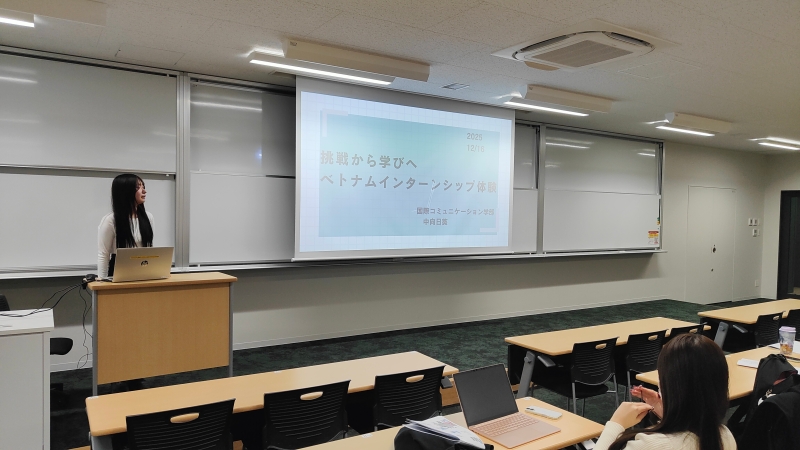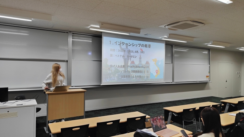 2025年12月16日(火)、「インターンシップ ベトナムクラス」(経済学部 三木担当)は4201教室にて成果報告会を行いました。プレゼンテーションのレベルは総じて高く、参加者の成長ぶりを感じさせる内容でした。