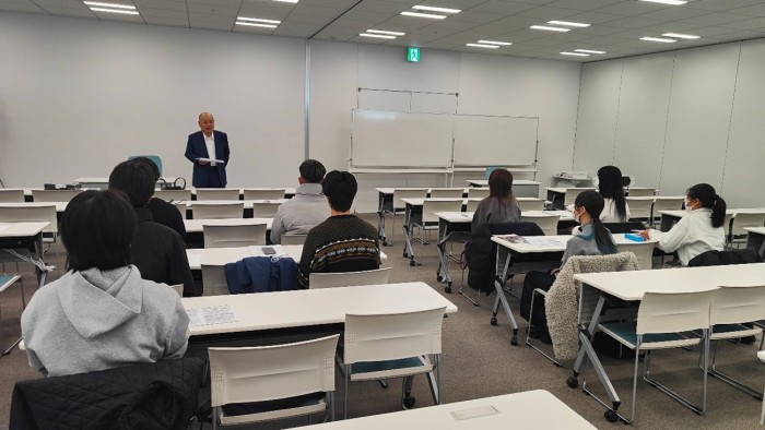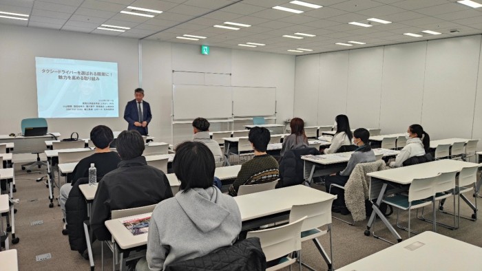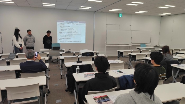 2026年1月14日(水)、経済学部の三木ゼミ2年生は、あべのハルカスキャンパスにて社会連携事業「タクシードライバーを選ばれる職業に!魅力を高める取り組み」「海外ライドシェア新勢力についての徹底調査」プロジェクトの最終報告会を実施しました。報告会には「海外ライドシェア新勢力についての徹底調査」連携先である株式会社交通論壇社の小北隆弘様、及び「タクシードライバーを選ばれる職業に!魅力を高める取り組み」連携先の東京・日本交通株式会社の業務提携先である、梅田交通グループ代表の古知愛一郎様にご参加いただき、ご講評いただきました。