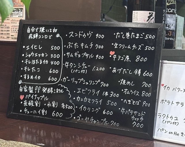 メニューはなんと日替わり!この日は 干しタコ、スルメイカの炙り、牛アゴ煮、ゴーヤチャンプルー、スンドゥブ を注文しました。