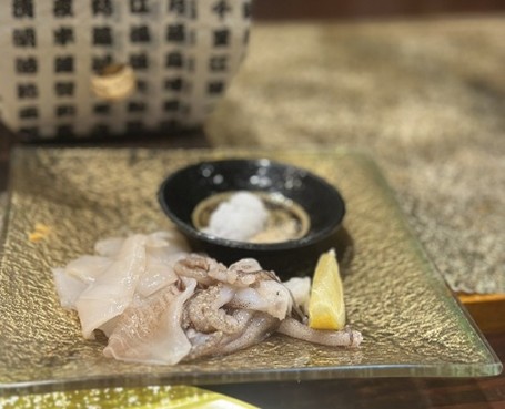 今回は北助松駅からすぐの裏北助松にある、隠れ家のような居酒屋 「.tami.」 さんに伺いました。暖簾に描かれた店名とタツノオトシゴを思わせるロゴがなんとも愛らしく、思わず写真を撮りたくなる外観です。扉を開けると、気さくで笑顔が素敵なママが迎えてくれました。木の温もりを感じるテーブルや柔らかな照明が、居心地のよい空間を演出しており、素敵な安心感がありました。