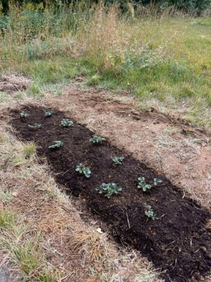 いただいたイチゴの苗を丁寧に植えました。し尿処理工程から生成される脱水汚泥に給食センターの調理くず、落葉、木くずなどの副資材を加え、約2週間かけて堆肥化した有機肥料をいただいてきて使用しています。