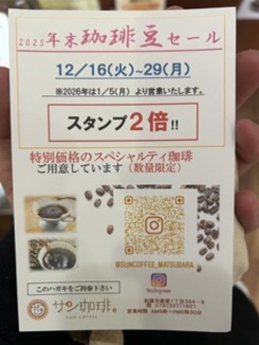 今回、再びサン珈琲さんに伺わせていただきました!前回ロイヤルブレンドを200g購入させていただき、11月22日に河内長野で開催した、キャンプカフェにてハンドドリップで販売させていただきました。するとお客様から「おいしい」と大変好評でした!