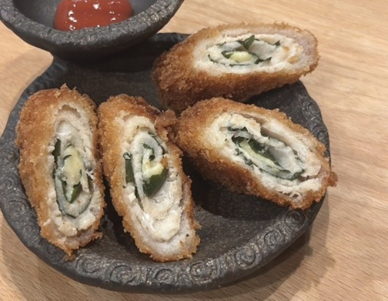 続いて 「胸肉のチーズしそ巻きフライ 梅ソース添え」。見た目のポップさに反して、味のバランスは抜群で、どれかが主張しすぎることもなく、まとまりのある一品。そして人知れず鎮座する真っ赤なソース。ケチャップに見せかけて実は “梅ソース”。付けてみると、この酸味が一度バランスを壊しつつも、最後には全体をより面白くまとめてくれて、“もう一段階おいしさを跳ね上げる”役割をしていて感動。