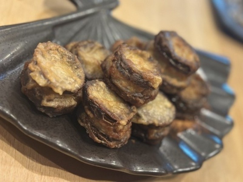ここで季節の野菜の天ぷらとして 「茄子のはさみ揚げ」 が登場。扇形の器に美しく盛られた茄子たちを見て思わず「お〜!」と声がもれました。写真映えNo.1の美しさ。食べてみるとホロホロの茄子が頬を蕩けさせるほど柔らかく、噛むのを拒んでくるほどでした。