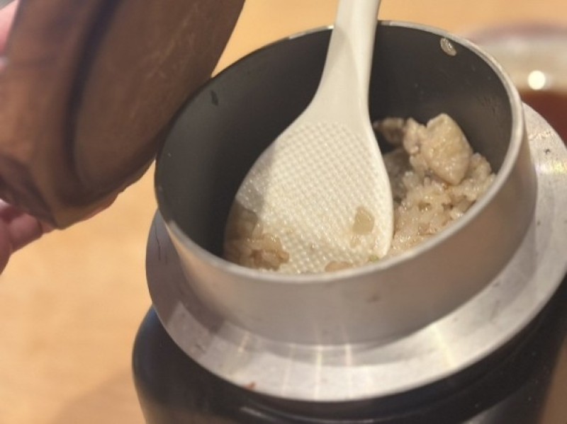そして〆の 「若鳥ときのこの釜飯」 が、テーブルに運ばれた瞬間の香りが強烈に食欲をそそります。思わず写真も撮らずすぐに茶碗へ盛ってしまいました!