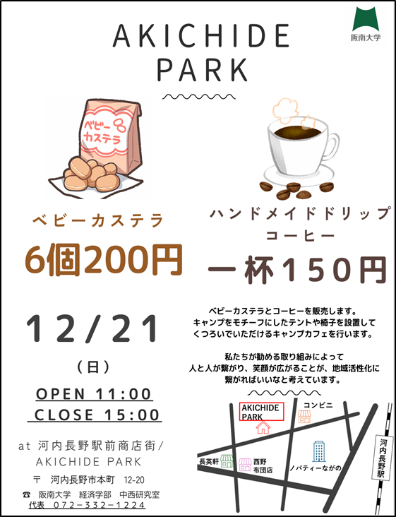 11月22日(土)河内長野のAKICHIDEPARKで、毎月一回定期イベントのベビーカステラを販売しました。これにキャンプカフェをコラボさせました。ベビーカステラだけでなく手動ミルで挽いたコーヒーも販売しました。朝早くから集合し、まず、テント張りから始めます。テントの杭が刺さらなかったり、コーヒーカップがなかったりと、てんやわんやでした。なんとかイスやテーブルもセッティングし終えて、いざテントの中に入ってみるととんでもない量の石が足裏をえぐってきました…テントは完全にオブジェですね。(笑)