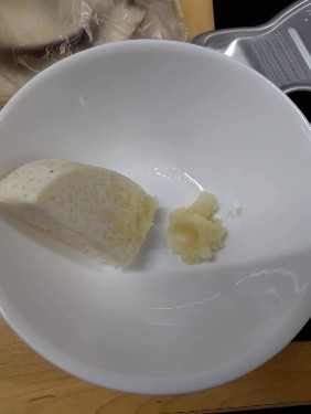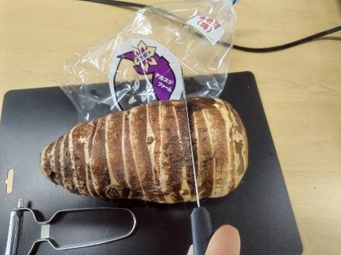 海老芋の頭の部分を使って「とろろ」と「マッシュポテト」の試作を行いました。とろろにしようと生のまま大根おろし器ですりおろしてみました。長芋のような粘りは出ず、大根おろしのようなさらっとした状態になり、とろろにはなりませんでした。
