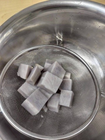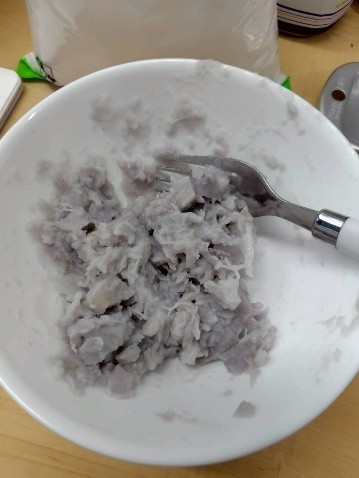 次に、海老芋を15~20分程茹で、マッシュポテト風にしてみました。皮は硬く、スプーンやフォークで刺しても皮部分が残る一方で柔らかい部分はジャガイモのようにホクホクとした食感になりました。