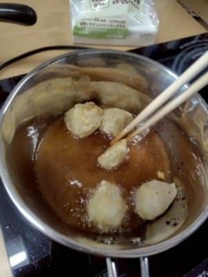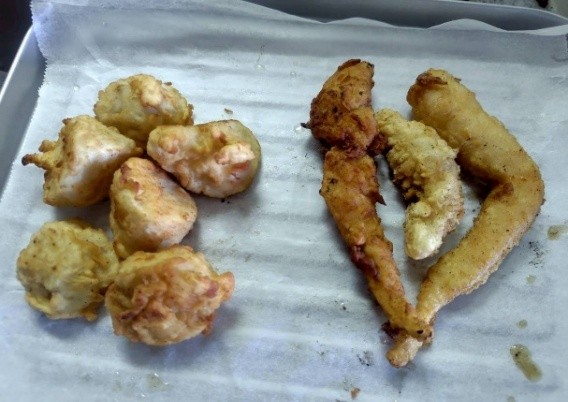 海老芋の皮が厚く固い部分を考慮して、4号サイズの海老芋を使った天ぷらを試作しました。最初は天ぷら粉だけで揚げたところ水分が多く衣がつきづらくベチャっとした食感になったため、天ぷら粉の後に小麦粉をまぶしてから揚げる方法に変更。すると表面はカリッと、中はホクホクでおいしい天ぷらに仕上がりました。
