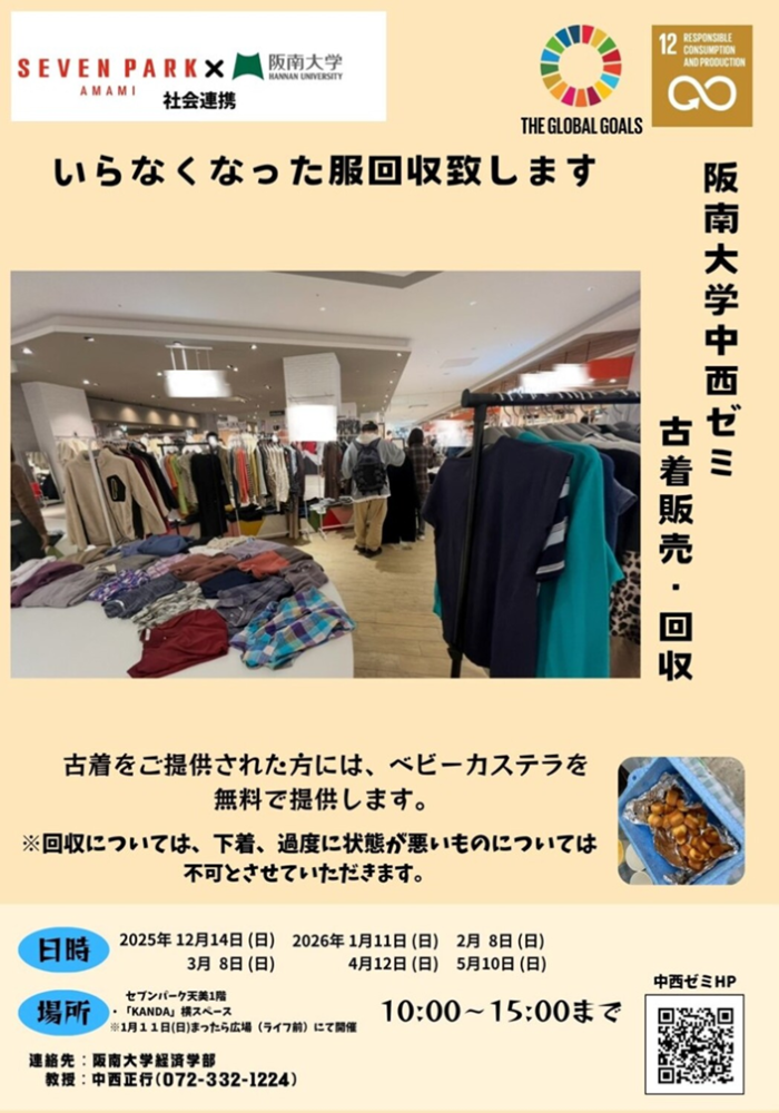 「古着を回収し、販売もする。それでいて地域を活性化し、ビジネスも応援する。」をテーマに中西ゼミでは古着の販売を行っています。この取り組みはセブンパーク天美、泉大津市北助松商店街、岸和田駅前通商店街、阪南市MY舞マルシェ、金剛銀座街商店街など、どんどん広がっています。 これからも精力的に活動していく次第でございます。皆さま、是非一度お越しいただければと思います!