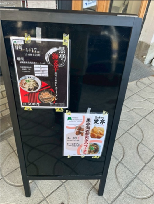 1月17日に金剛のわっくカフェで黒亭海老芋煮っころがしラーメンを販売しました。11月に富田林市にある農家のナカスジファームさんで海老芋畑を見学させていただき、海老芋の歴史や育て方を知りました。今回はそのナカスジファームさんの海老芋を使用しました。
