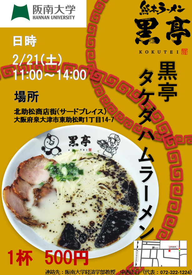 泉大津市、高石市、UR都市機構、北助松商店街、阪南大学が包括連携協定を結び、 北助松商店街および助松団地近隣の活性化を行っています。 その一環で熊本の黒亭ラーメンとタケダハムのつるし焼豚を掛け合わせたメニューを販売しました。 地方と地方を結び、素敵な場所になっていけばと思います。 黒亭タケダハムラーメンチラシ
