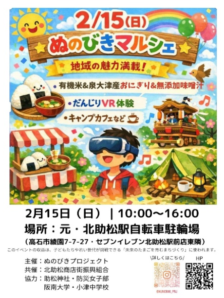 北助松商店街では、古着の回収イベント「フクチェン」、地域の魅力発信「ぬのびきプロジェクト」、グルメ散歩、チャレンジショップ「サードプレース」などの取り組みを行っています。