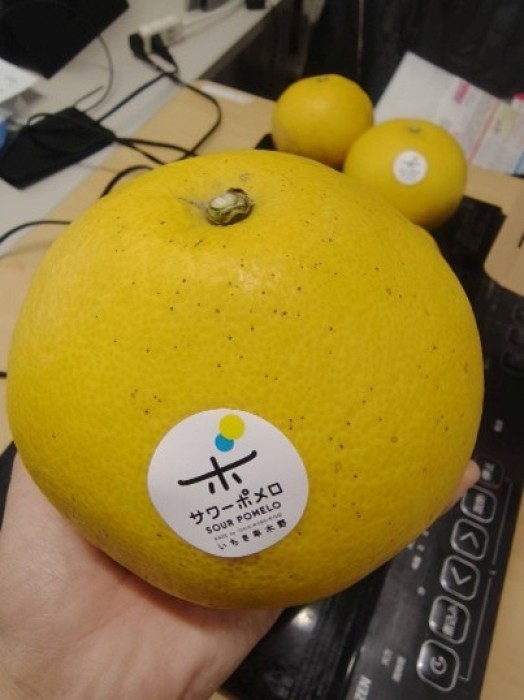 今回はその一環として、いちき串木野市の特産品である「サワーポメロ」を使い、定藤先生と一緒にジャム作りに挑戦しました。サワーポメロは文旦の仲間で、さっぱりとした甘さが特徴の柑橘です。とても大きな果実で、1個でゆず約5個分の大きさだそうです。