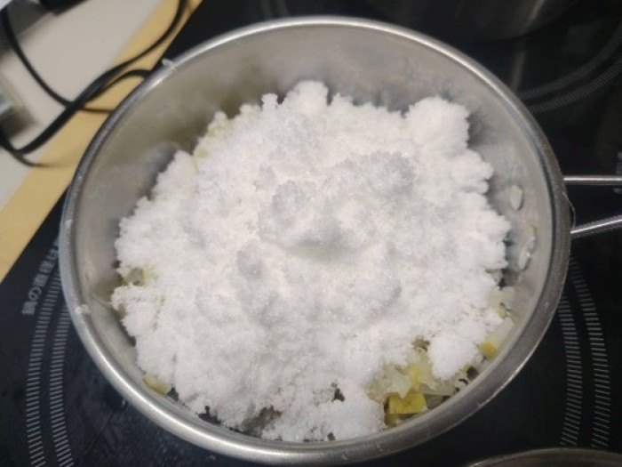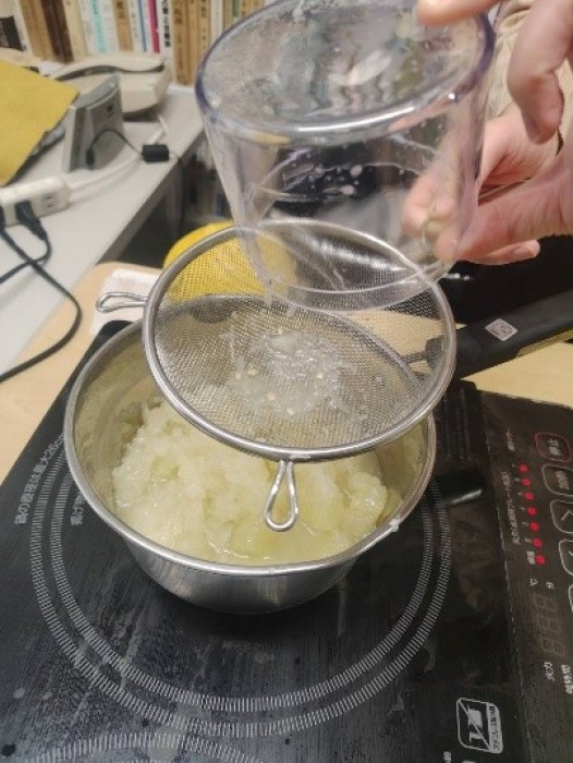 まず、サワーポメロを半分に切り、果汁を取る作業から始めました。最初は絞り器を使って果汁を取ろうとしました。サワーポメロはレモンやゆずに比べてかなり大きく、絞るのに時間がかかってしまいました。そこで作戦を変え、絞り器ではなく手で果肉をほぐしながら果汁を取る方法にしました。この方法の方が効率よく果汁を取ることができました。