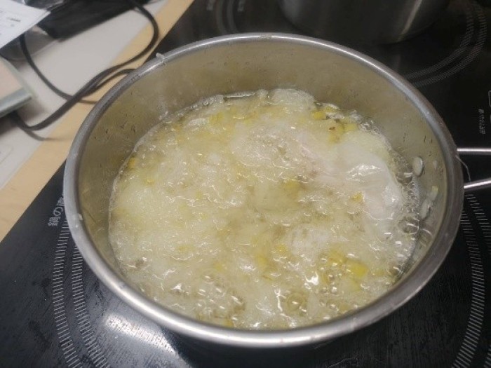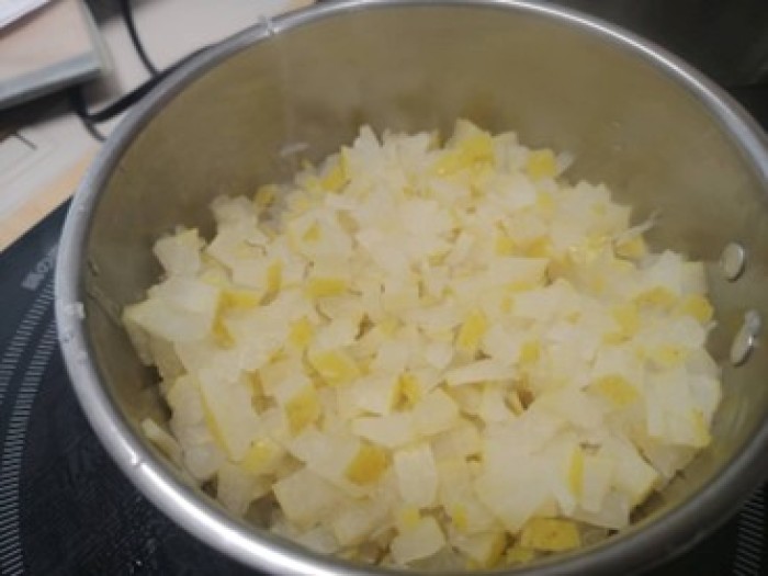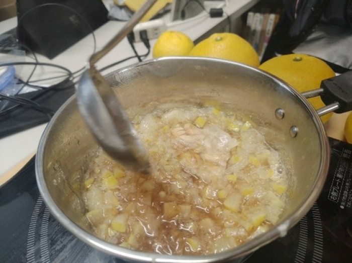 皮はみじん切りにし、種はお茶パックに入れ、煮る準備をします。種を一緒に入れることでジャムにとろみがつきやすくなるそうです。果汁とみじん切りにした皮、そしてお茶パックに入れた種を鍋に入れて加熱しました。加熱していくとあくが出てくるため、こまめに取り除きながら煮ていきます。