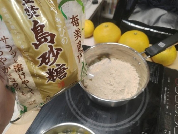 その後、砂糖を加えてさらに煮詰めていきます。砂糖の種類を変えて、グラニュー糖と奄美産サトウキビの島砂糖の2種類でジャムを作りました。