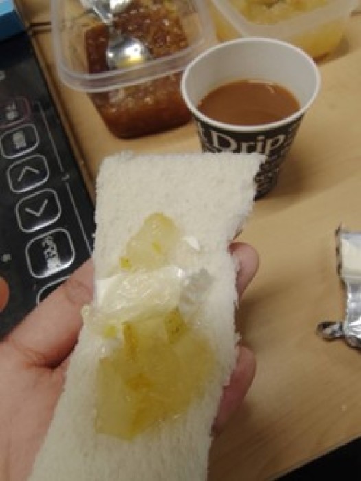 パンに出来上がったジャムをのせ、バターやチーズと一緒に試食しました。サワーポメロの爽やかな風味があり、とても美味しく仕上がりました。グラニュー糖で作ったジャムはさっぱりとしてパンとの相性が良く、島砂糖のジャムは味がやや濃く、ほのかな苦みがありました。また、先生に淹れていただいたコーヒーと一緒に味わうと、島砂糖で作ったジャムの方がコーヒーの苦みとよく合うと感じました。今後は、いちき串木野市での合宿を通して、このジャムを活用したクッキーなどの試作を行い、地域活性化につながる商品開発についてつなげていきたいと考えています。