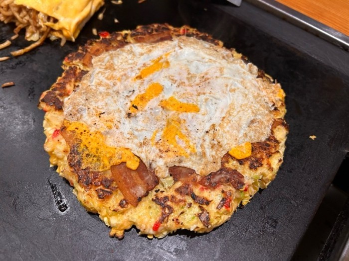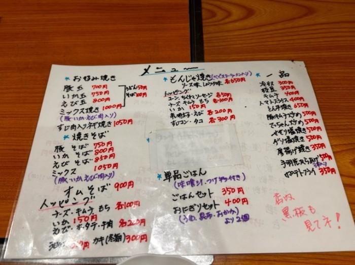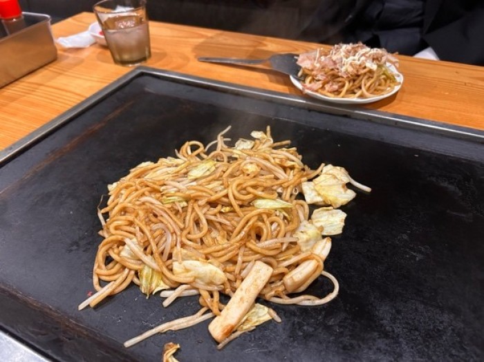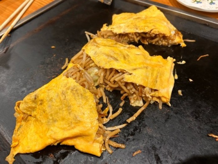 王道のイカ焼きそばと豚玉のお好み焼き、そして、食べたことがなかったオムそばを注文しました。4月から価格が変更になり150円ほど値上がりするということです。何も知らずに3月27日に滑り込めたので、価格改定前に訪問できたのはラッキーなタイミングでした。一品料理も豊富で、一緒にお酒を飲みたくなりました。予定があるため、お酒は控えて、グルメを本気で楽しむグルメ散歩回となりました。