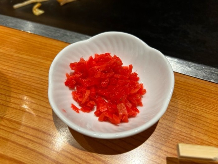まず最初に頂いたのは、「イカの焼きそば」。大サイズを頼んだので流石のボリューム。もっちもちの太麺にイカ、キャベツ、もやしの入った王道焼きそば。「上品な焼きそば」で絶賛の一品です。高松さんは辛いものが苦手なので、別で紅生姜を頂こうと思いました。そうするとわざわざ小皿にのせてご用意いただきました。ほっこりする優しさがあり、思わず小皿の紅生姜をパシャリ。ご要望があればお伝えすると対応してくださいます。