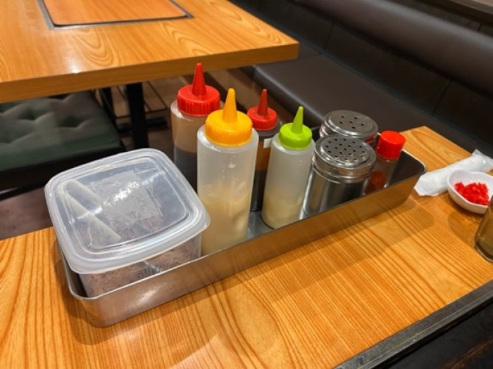 卓上の調味料がかけ放題で、普通のソース・マヨネーズ・鰹節・青のりに加えて、からしソースに、からしマヨネーズも揃えた調味料のラインナップ。この優しい味の焼きそばに、からしマヨネーズのパンチを合わせると、クセになるあの味。焼きそば好きはぜひ食べてほしいです。