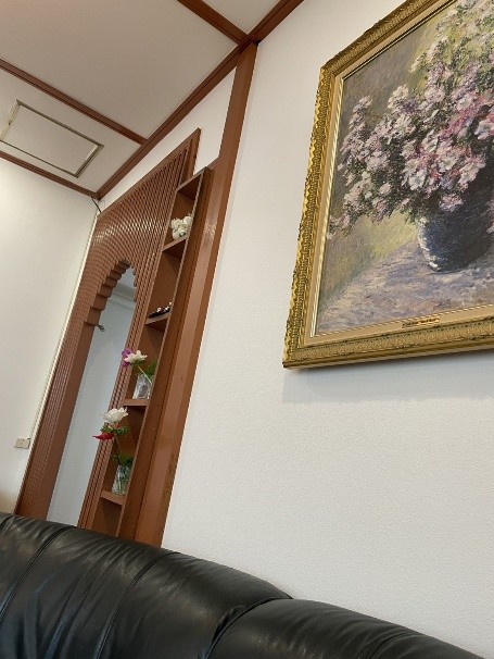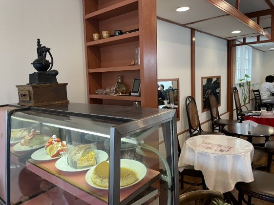 いきなりビューティフルでワンダフルなケーキでお出迎え頂きました。次回の取材ではケーキの報告をしますね。取材の許可をこころよくお引き受けいただき、視線を店内にむけると阪南大学の教職員の方がたくさんいらっしゃいました。大学とお店が相思相愛です。店内にソファーやアンティーク調の家具があり、応接間に通されたようでくつろげます。
