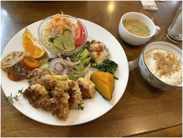 頂いたのはロコモコ。読売新聞(大阪)2024年7月6日で阪南大学シーハン先生が、ジューシーなハンバーグとご飯、目玉焼き、サラダのバランスの取れたメニューとご紹介されています。素晴らしいバランスとボリュームに圧倒されました。是非、河内天美界隈の名物にしたいですね。続いて、日替わりランチの若どり柚子胡椒です。野菜のいろどりが素敵です。いかにも健康的ですね。柚子胡椒の風味が見た目でも伝わってきます。