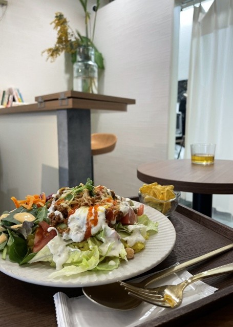 ランチメニューはタコライス(写真)とチキンオーバーライス。タコライスはタコスで提供されていたそうですが、お客様のニーズをとらえて、ライスに変更。その代わりにタコスとディップを添えられています。ディップが濃厚で最高です。チキンオーバーライスはチキンのボリュームがありまくり。お腹がいっぱいです。野菜も満載でヘルシ~