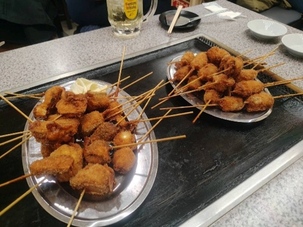 最初に頼んだのは串カツ。かぼちゃ、たまねぎ、うずら、肉などをいただきました。5本からの注文で、揚げたてはとにかく熱々!