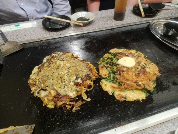 次に、お好み焼きは豚玉といか玉の大サイズ、そして焼きそばを注文。ボリュームがしっかりあって、みんなでシェアしながら楽しく食べることができました。さらに、ねぎ豚と大名焼きも注文。私は大名焼きを初めて食べたのですが、中に焼きそばも入っていてボリューム満点!かなり満足感のある一品でした。お好み焼きが運ばれてきたときに、すでにマヨネーズがかかっていて、そこに自分たちでソースをかけて広げるスタイルだったのも印象的でした。
