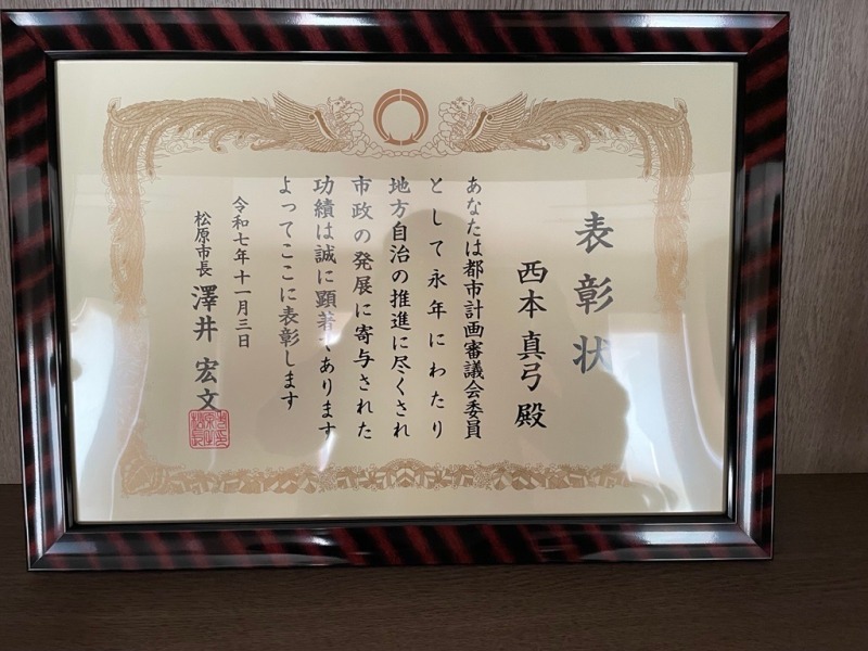 西本副学長は、2016年8月1日から松原市都市計画審議会の会長を務めており、現在の任期は2026年7月31日までとなっています。都市計画に関する審議・提言を通じて、市政の発展に大きく寄与してきた功績が評価され、今回の表彰に至りました。