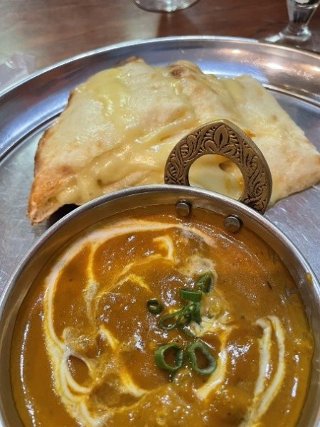 カレーとナンはもちろん、万博で食べておいしかったビリヤニもありましたが、今回はレディースランチを注文。サラダとチーズナンにカレーとドリンクが選べます。私はマトンカレーとマンゴーラッシーにしました。