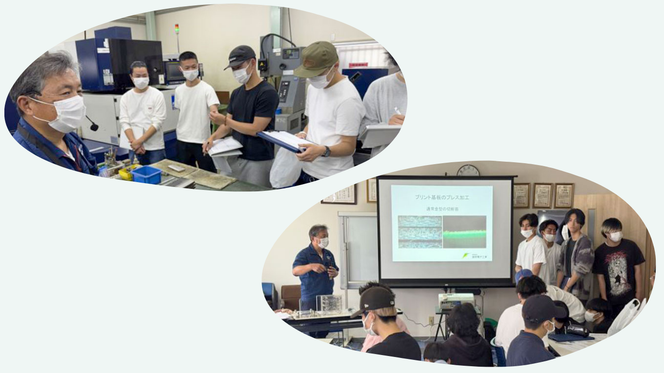 藤原電子工業では、金型技術とプレス加工について学び、また作業をしてる所を見学しました。社長自ら、たくさんの機械を一つひとつ丁寧にどういった機械なのかを説明していただいて普通じゃできない体験をしました。