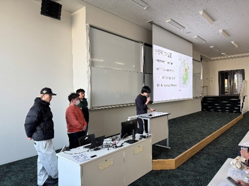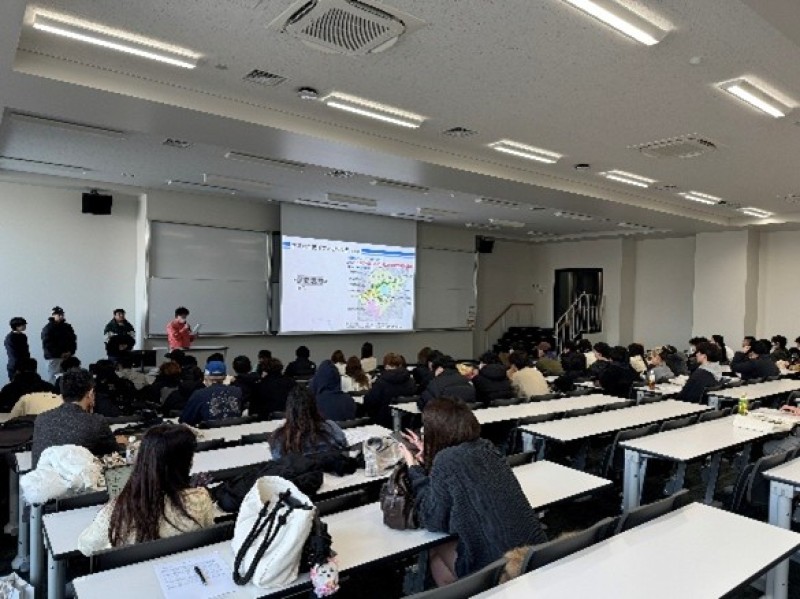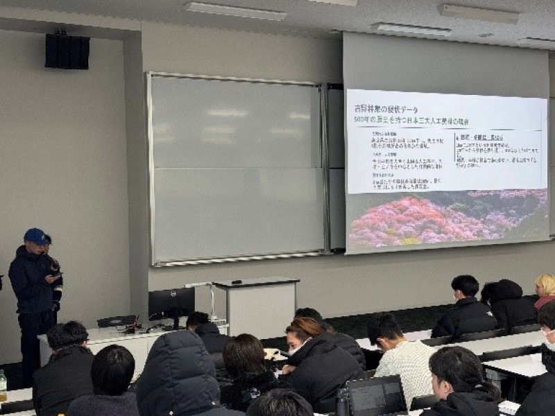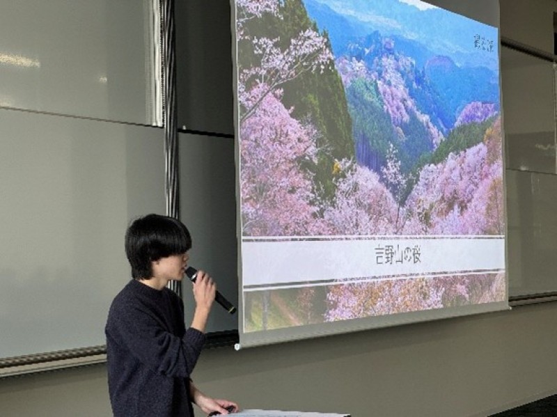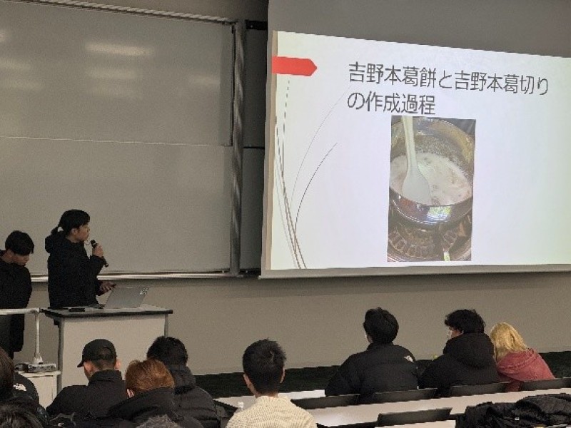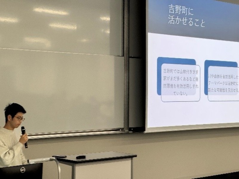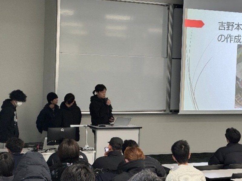 経済学部櫻井ゼミの2年生は、毎年、奈良県吉野町でフィールドワークを実施しています。今年度は吉野町の吉野山地区のまちあるきを実施したり、万博で吉野の割り箸ワークショップを開催したりしました。そうした吉野町の課題や現状を取り上げ、各テーマをゼミで学修しました。その結果を、各グループで報告しました。