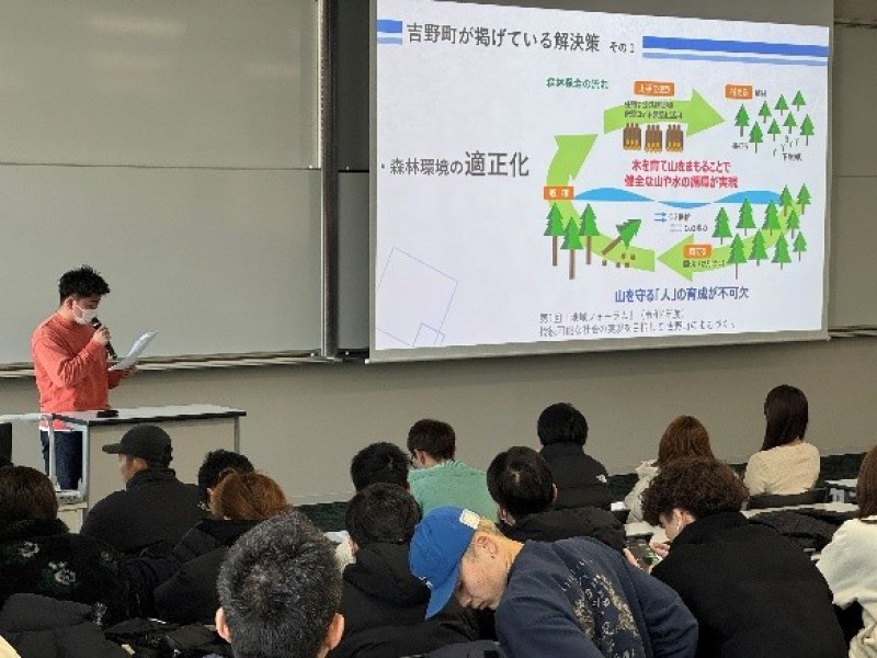 吉野町の課題として木材産業・林業の衰退、木材が売れないこと、労働者不足、現場の高齢化(人口減少による担い手不足)を挙げ、SDGsの推進で乗り越えようとしている。SDGsに関わる地域産業として、割り箸の製造を示す。環境保護では「吉野の清流を大切に!」として川遊び後のごみ持ち帰りを求める条例を制定した。地理的条件から吉野材の集積地となり「製材のまち」として発展してきたこと、また「里山林活性化による多面的機能発揮対策交付金」により住民・団体の保全活動を国が支援し、伐採材・枝葉の資源活用を通じ林業振興と地域経済活性化も目指すことを説明した。観光面では、ごみ持ち帰り等のマナー啓発や公共交通利用促進によるCO2削減を例示し、個人ができる行動を提言した。