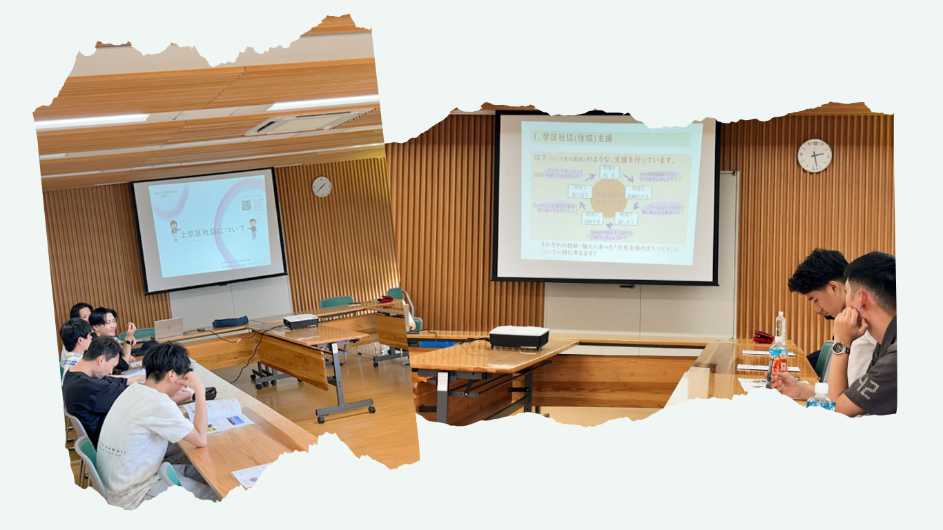 2025年8月6日に、京都市上京区の上京区総合庁舎4階・区民交流スペースにて、ゼミ実習として上京区社会福祉協議会の取組についてのレクチャーを受けてきました。そもそも、上京区はどのようなまちであるのか、そして社会福祉協議会はどのような組織であるのかを説明いただいたうえで、具体的な取組内容について、地域支援と個別支援、それぞれの内容をご教示いただきました。日頃の座学だけではなかなか分かりにくい地域福祉の実態について、豊富な事例と共にご紹介いただき、学生たちはより立体的な学びを深めることができました。このレクチャーを踏まえて、学生は京都の事例も取り入れたプレゼンテーションの作成を行い、12月のゼミナール大会や、1月の最終報告会に向けて準備を進めていきます。