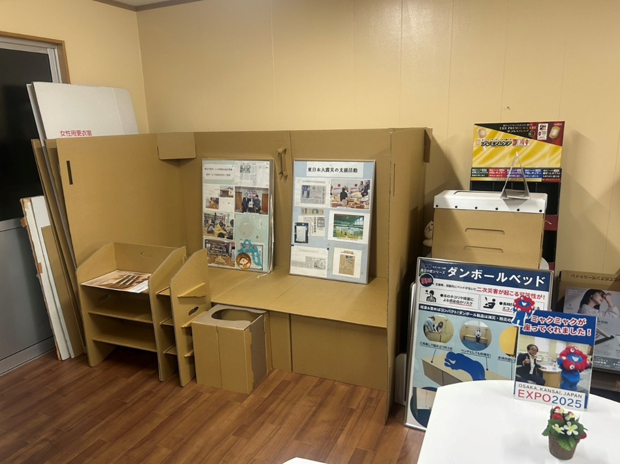 同社では、東日本大震災が起きた際に、被災地の復興支援を目的として、ボランティア活動でパーテーションや段ボール製のベッドや授乳室を1000台以上福島県に寄付しました。被災地ではプライバシーの確保が難しい中、同社の取り組みは、大きく注目され、新聞等のメディアで紹介されたとのことです。またコロナ禍の際には、看護師が患者の採血をするための、採血時に腕だけ通せる穴をくり抜いた飛沫感染対策のパーテーションをいち早く制作し約3万台を販売したそうです。