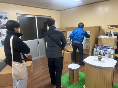 12月23日にマツダ紙工業株式会社(東大阪市)を訪問し、代表取締役の松田氏にお話を伺いしました。同社は1958年に設立され、段ボールのベッドや授乳室などの防災用品や販促用の什器など、特殊な段ボール製品の製造に力を入れています。売上の8割が化粧品などのパッケージ包装材で特殊用品(ダンボール製のベッドやタンス、椅子机など)は残りの2割とのことです。製造から納品までは、化粧品などのパッケージ包装材で4日、ベッドなどは約1ヶ月かかるそうです。